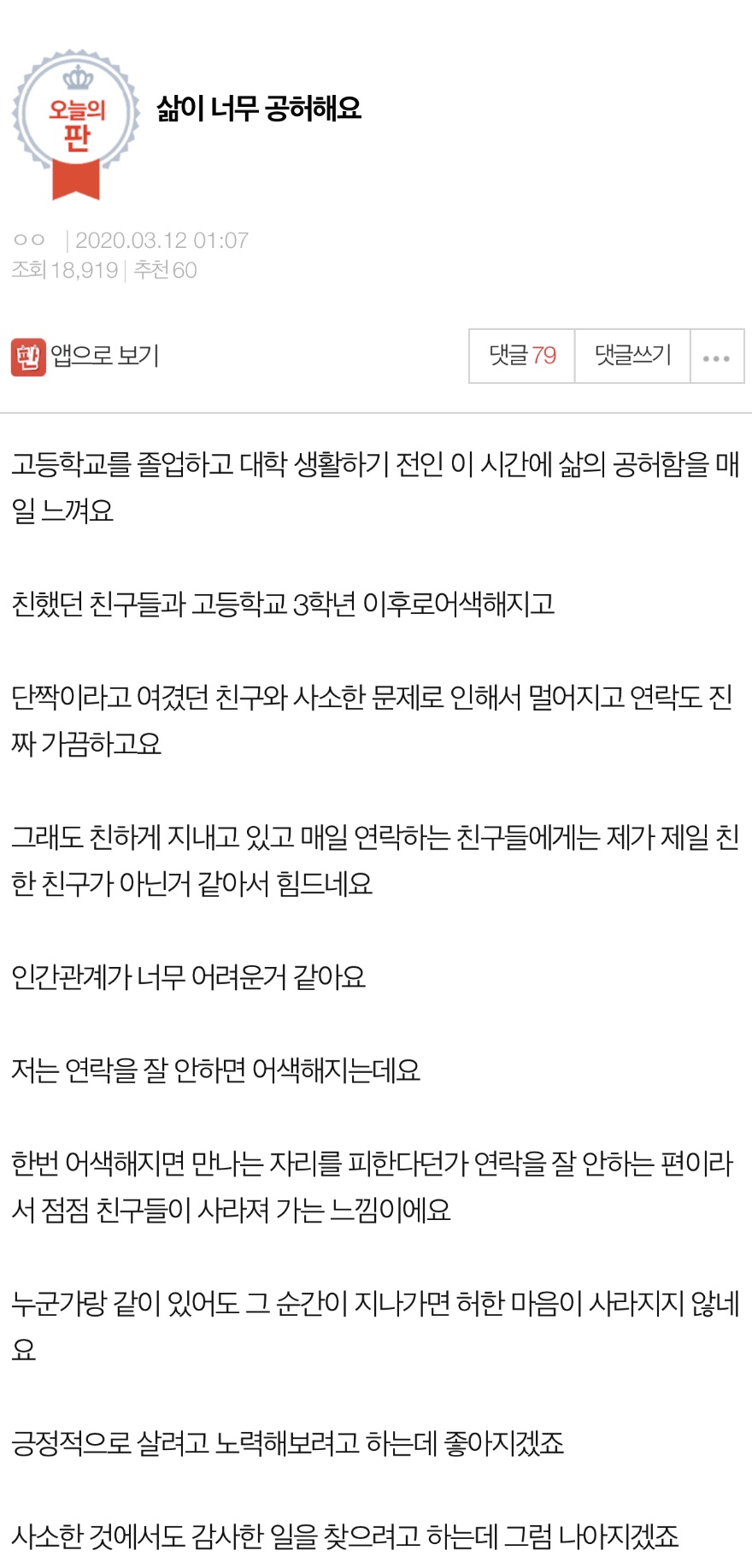 한 커뮤니티에 위와 같은 글이 올라왔다. BEST 고민사연으로 등재될만큼 많은 사람들이 공감하고 있음을 알 수 있다.